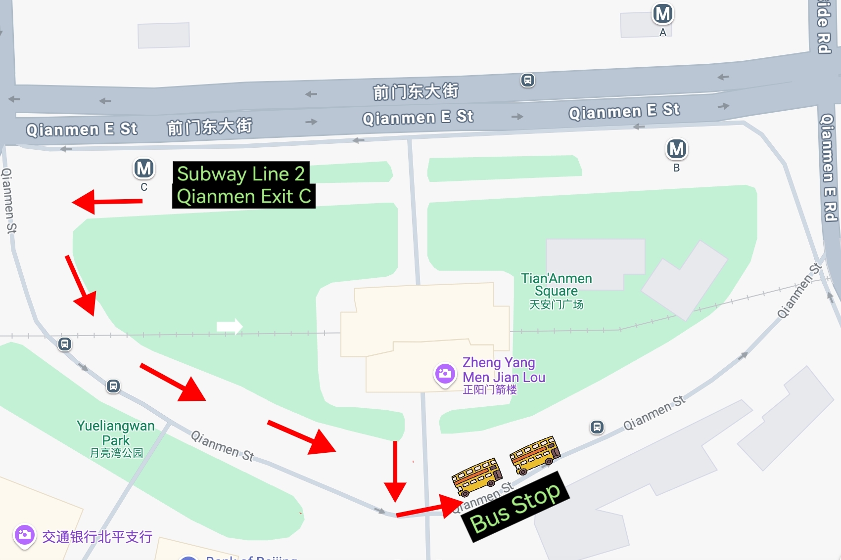 Pick-up/Drop-off point: Qianmen Dajie Beikou west side public bus stop(zhengyangmen arrow tower south west)