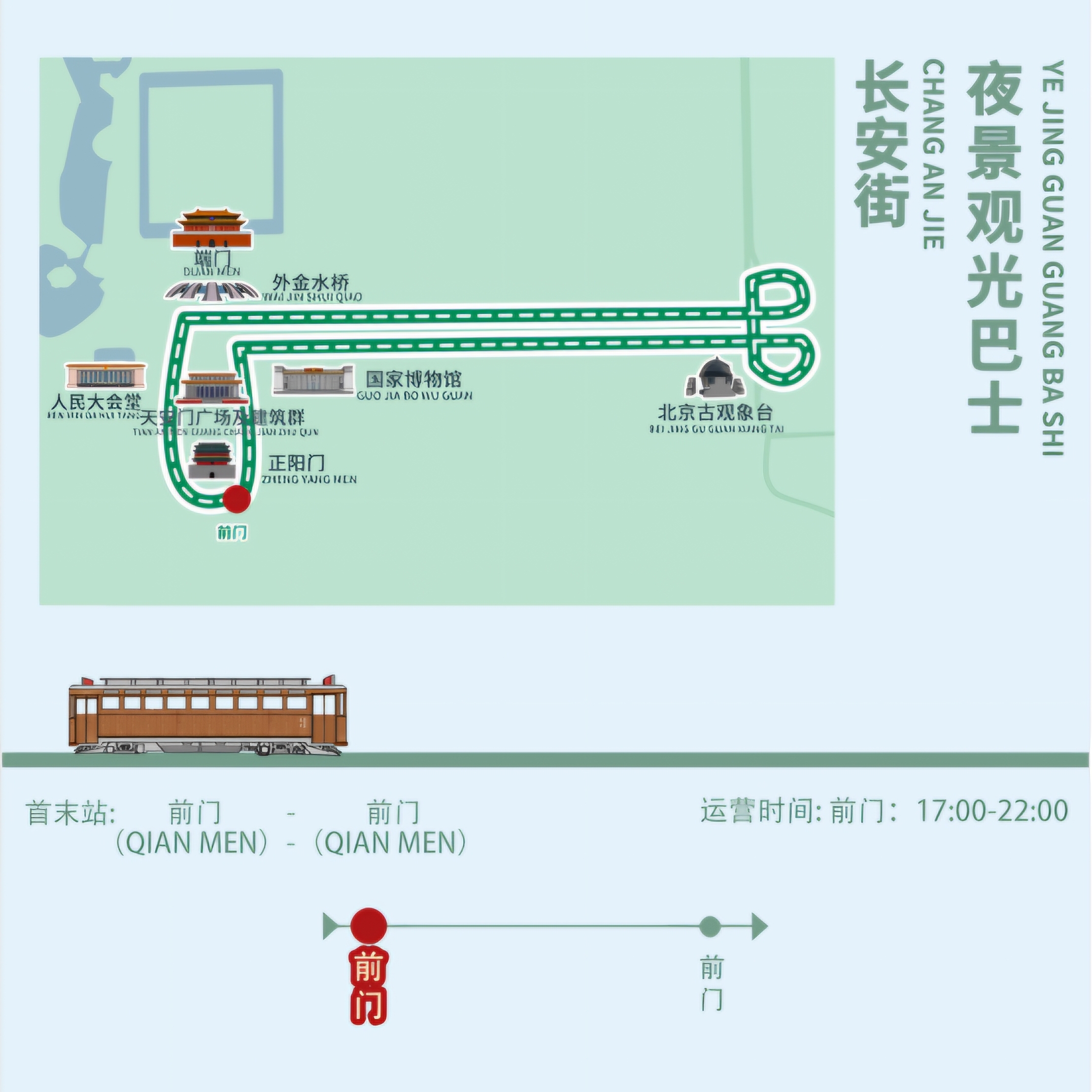 A local retro bus, a night tour of Beijing East Chang'an Avenue, departs at a fixed time every day from 17:00 to 22:00, with a rolling cycle. There is only a ticket, no tour guide service, the journey lasts 30-40 minutes, and there is no stop along the way.