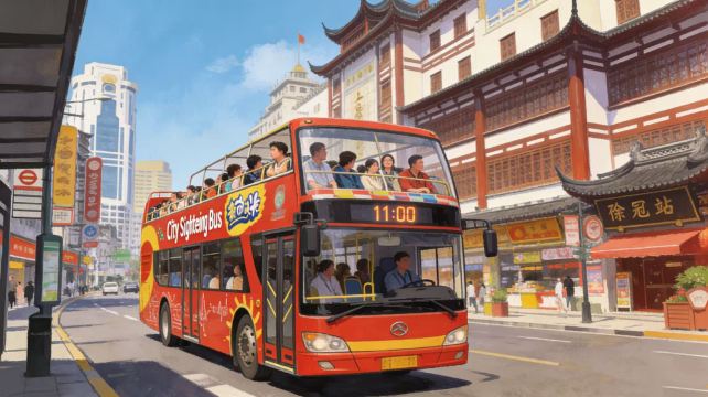6:15 p.m. – 7:00 p.m. Board the double-decker City Sightseeing Bus for a 45-minute city tour, passing by iconic landmarks including the Bund and Yu Garden.